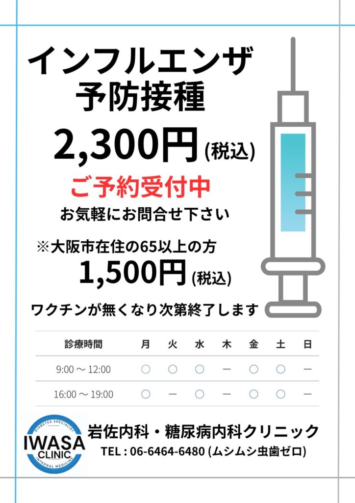 <予約制>インフルエンザの予防接種を開始します。料金は2,300円(税込)(65歳以上の方は1,500円)です。ワクチンがなくなり次第終了します。 2025年10月1日 最終更新日時 : 2025年11月18日 iwasa-dm-clinic 大阪市にお住いの65歳以上の方、60歳から64歳で一定の障がいを有する方は助成があります。