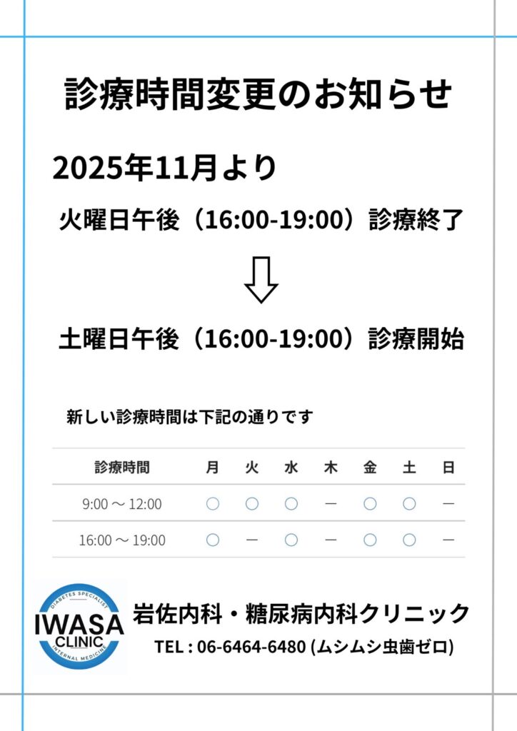 <診療時間変更のお知らせ>2025年11月から火曜日午後の診療(16:00-19:00)を終了し、土曜日午後(16:00-19:00)の診療を新たに開始いたします。